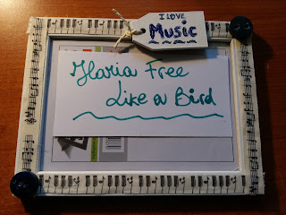 Ilaria del blog FREE LIKE A BIRD ha preparato una cornice a tema "I love music" decorata con nastri con pentagramma e pianoforte, con tag in legno e bottoni di sughero riciclati, colorati con smalto per unghie.